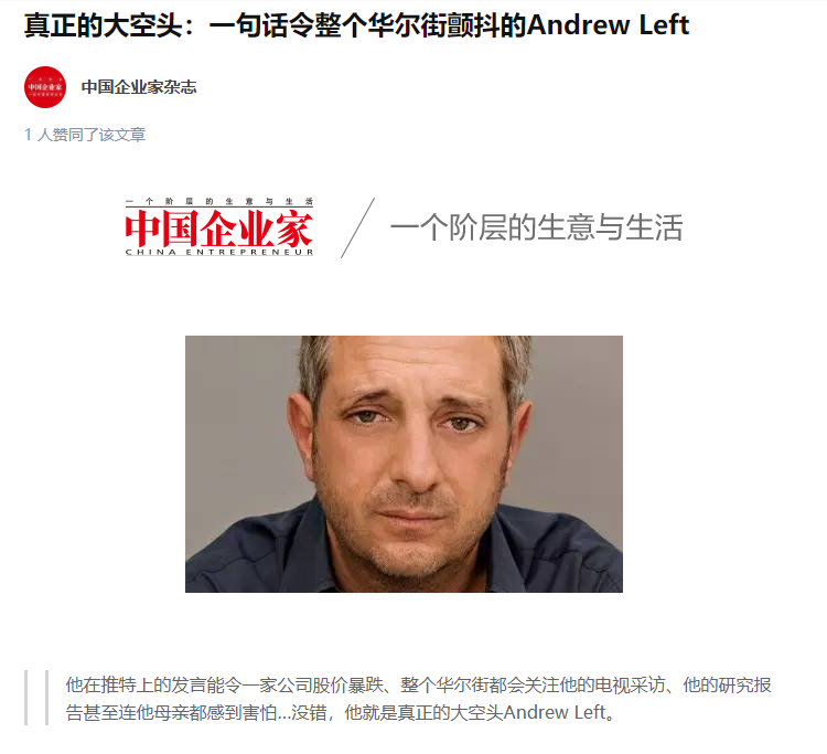 而这次代表香橼站在台前的,一如既往的,是这家公司的传奇人物,安德鲁·莱夫特。