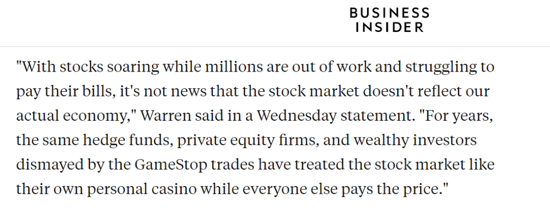 “就是这帮在GampStop中受损失的同一批人,一直以来都把股票市场当做自家赌场,而我们其他所有人都在付出代价。”