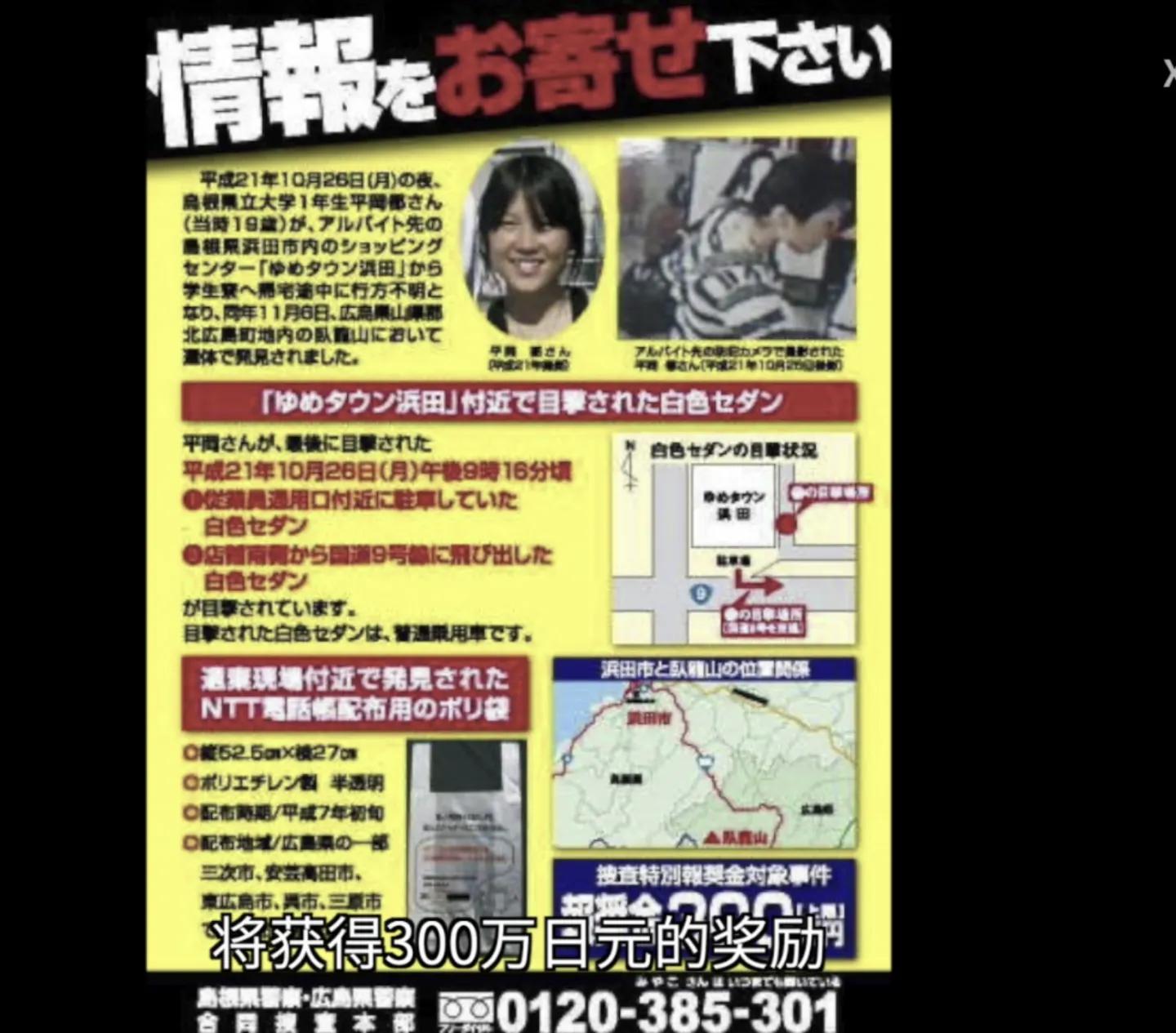 1月26号晚上九点下班以后,目击者见到她上了一辆白色的旅行汽车 。寻着这条线索才找到的凶手的。媒体一直跟踪报道,有一次在报道的时候,视频中传来一个女子的声音,声音太小,基本上听不清,好像是在说,这确实很痛苦,为什么是我?人们不禁产生联想,觉得这个声音有可能是平冈都的。令人毛骨悚然。由于迟迟无法破案,在全国产生了很大的影响,警方压力很大。2010年一月,日本警察厅最高长官对着平岗都的一项发誓,一定要把杀害她的凶手找到。